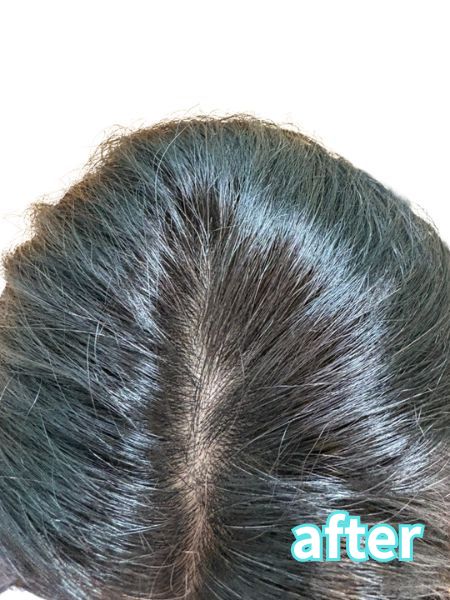白髪が気になるトップ部分の分け目だけに使ってみました。ピンポン玉大をトップ部分に乗せて、指示通り少し揉みこみ、15分置いて流しました。使用したのはピンポン玉3個分。シャンプートリートメントは普段使っているもの。