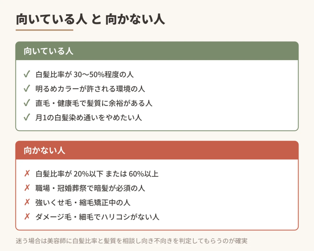 - 白髪比率30〜50%・明るめカラー可の環境ならおすすめできる