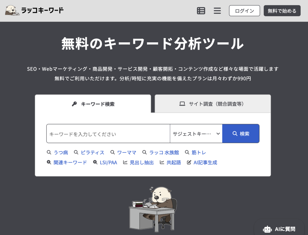 ラッコキーワードは、サジェストキーワードの取得に特化した国産ツールです。シンプルな操作性で初心者にも使いやすく設計されています。