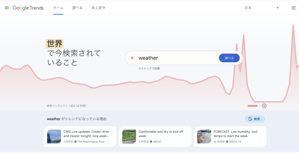 Googleトレンドは、キーワードの人気度の推移を時系列で確認できるツールです。季節性のあるキーワードやトレンドの把握に適しています。