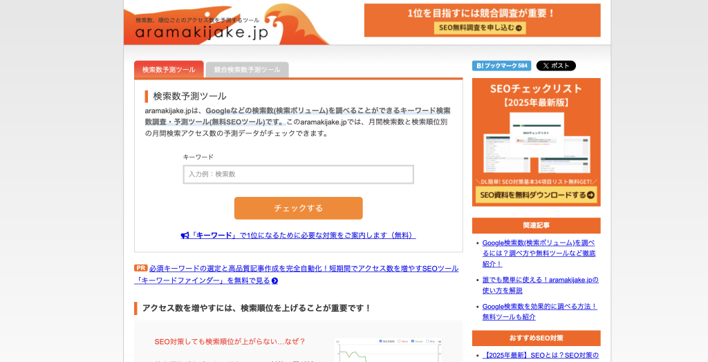 aramakijakeは、シンプルな検索ボリューム調査ツールです。GoogleとYahoo!の両方の検索ボリュームを確認でき、SEO効果の予測も可能です。