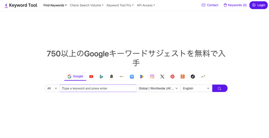 Keyword Toolは、750以上のGoogleサジェストキーワードを無料で取得できるツールです。YouTube、Instagram、Twitterなど、複数のプラットフォームに対応しています。