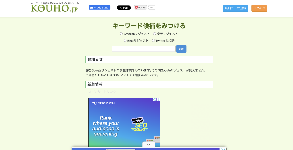 KOUHOは、シンプルなサジェストキーワード取得ツールです。五十音順での表示や、Amazon・Twitterのサジェストも取得できます。