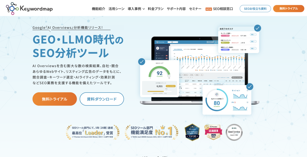 Keywordmapは、国産のSEOツールで、競合分析に強みを持ちます。日本のSEO事情に精通した機能設計が特徴です。
