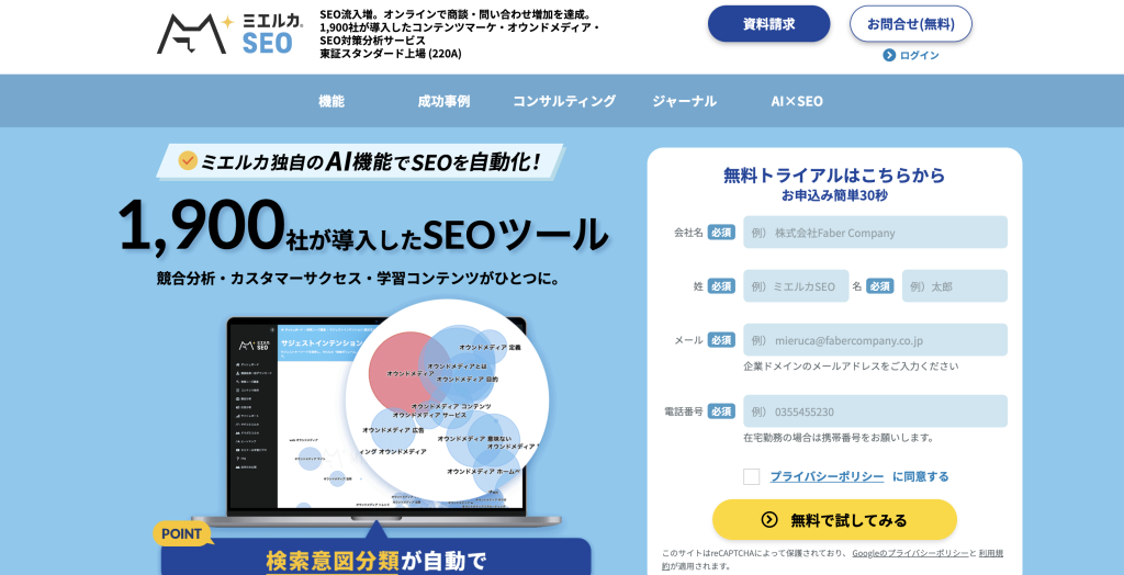 ミエルカは、AI技術を活用したSEOツールです。ユーザーの検索意図を詳細に分析し、コンテンツ作成をサポートします。