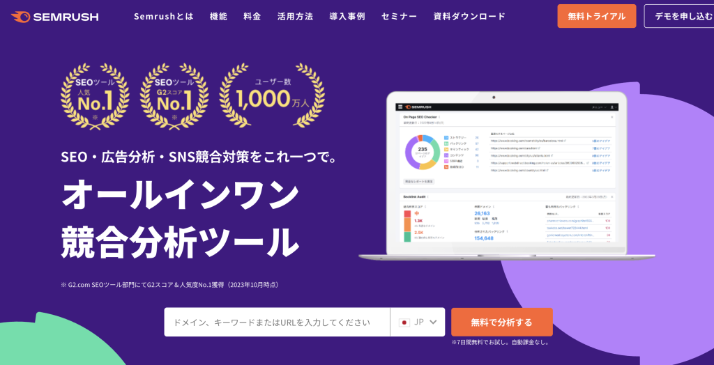 SEMRUSHは、SEOだけでなくSEM(検索エンジンマーケティング)全般をカバーする包括的なツールです。