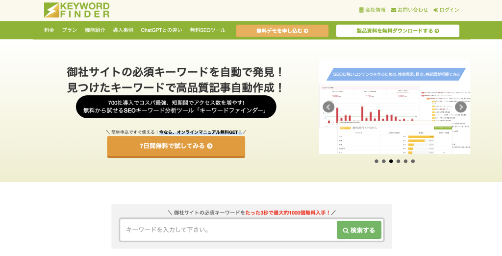 キーワードファインダーは、SEO施策の自動化に特化した国産ツールです。AIが最適なキーワードを提案します。