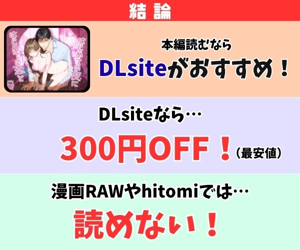 DLsiteです。「はじめての恋とはじめての夜に」はDLsiteの独占先行配信タイトルであるためどこよりも早くに最新話を読むことが可能ですし、新規会員クーポンを利用することで300円OFFでお得に購入することもできます。