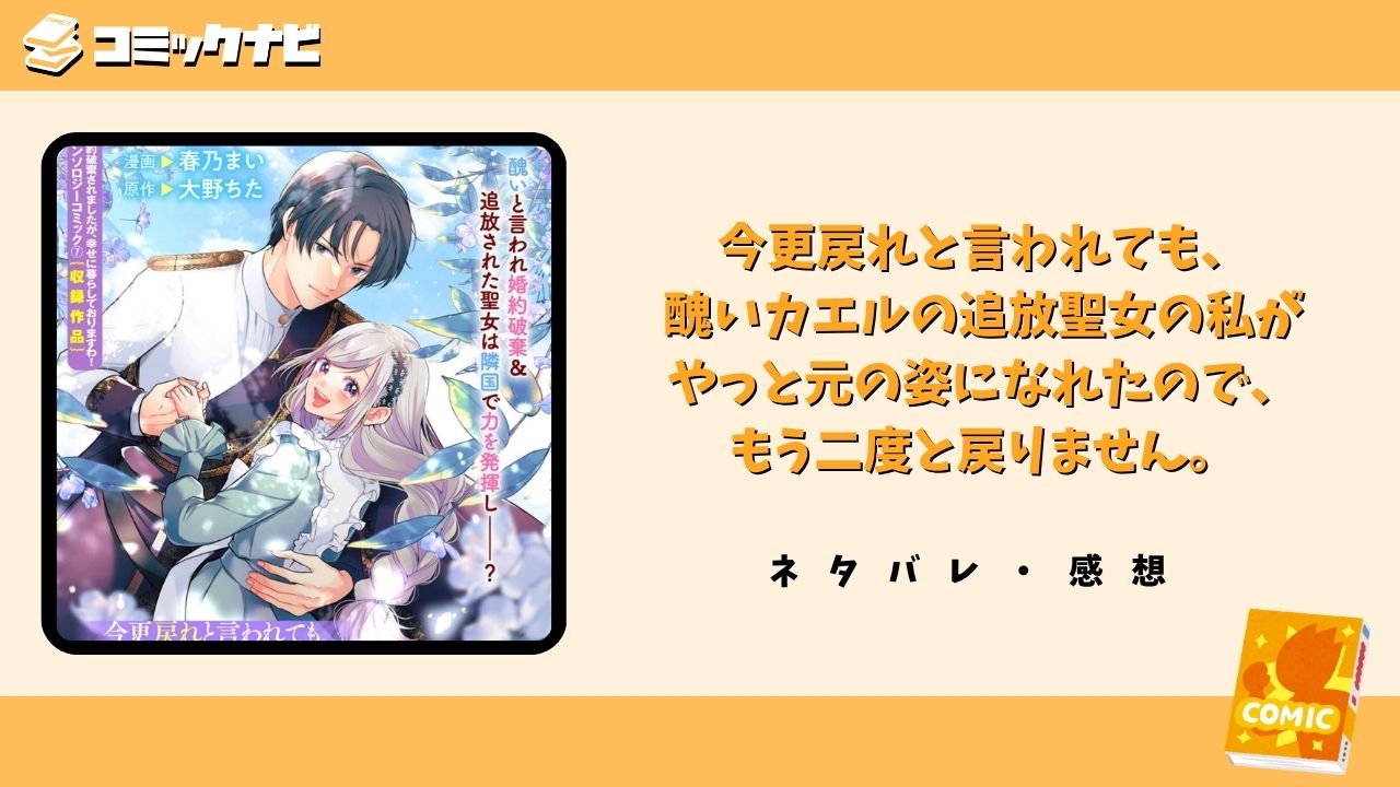 漫画『今更戻れと言われても、醜いカエルの追放聖女の私がやっと元の姿になれたので、もう二度と戻りません。』は、醜いカエルの姿になった聖女が婚約破棄と追放を受けながらも、隣国で真の価値を認められて幸せを掴む物語です。