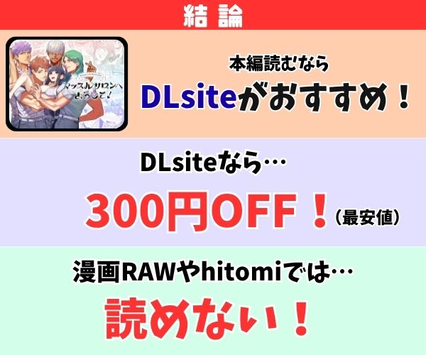 DLsiteです。「マッスルサロンへようこそ!」はDLsiteの独占先行配信タイトルであるためどこよりも早くに最新話を読むことが可能ですし、新規会員クーポンを利用することで300円OFFでお得に購入することもできます。