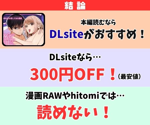 DLsiteです。「元カレの弟に筆おろししてみた」はDLsiteの独占先行配信タイトルであるためどこよりも早くに最新話を読むことが可能ですし、新規会員クーポンを利用することで300円OFFでお得に購入することもできます。