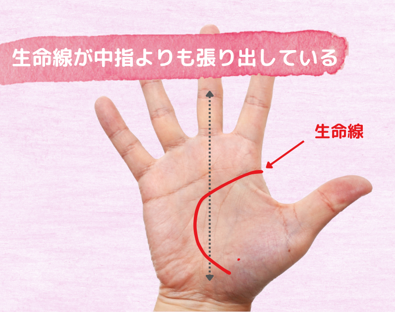 生命線が大きく弧を描き、中指の外側まで張り出している人は、エネルギッシュで恋愛にも情熱を注ぐタイプです。