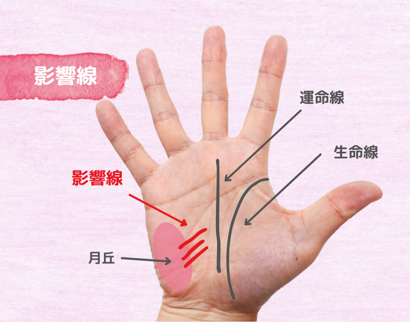 影響線とは、手首の近くから運命線や生命線に向かって斜めに伸びてくる細い線で、誰かの存在が人生に大きな影響を与えることを示します。