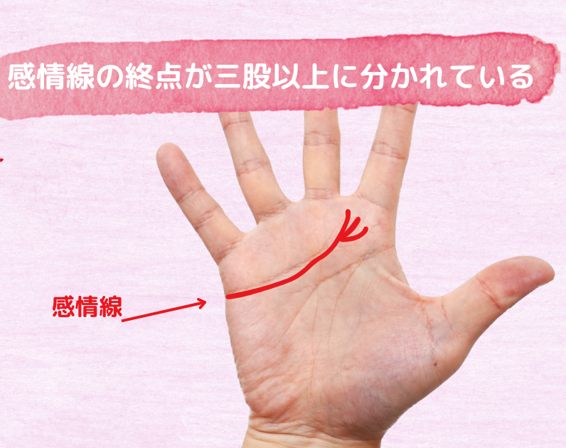 感情線の終点が三股以上に分かれている手相は、強い恋愛運の象徴です。