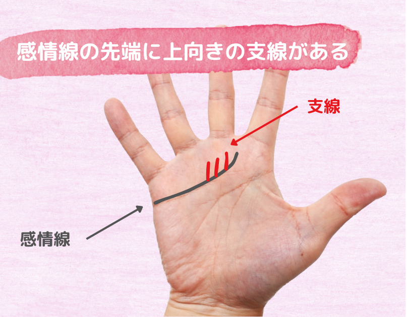 感情線の先端から上に向かって細かい線が伸びている人は、ポジティブな感情を持ちやすく、恋愛においても前向きなエネルギーを発するタイプです。