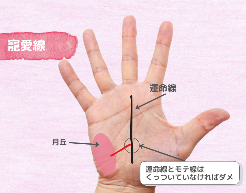 この運命線に向かって、小指下にある月丘から伸びてしっかりとくっついている線が、寵愛線です。