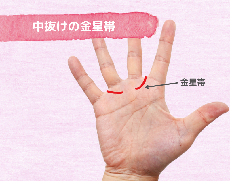 人差しと中指、薬指と小指を結ぶ半円のように描かれた線の、モテ線の金星帯が中抜けのの状態になっています。