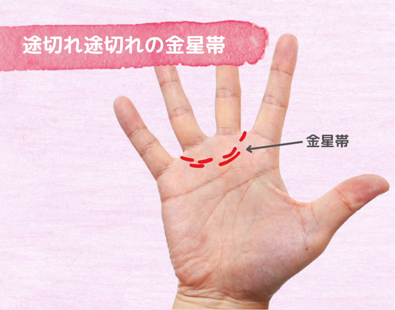 人差しと中指、薬指と小指を結ぶ半円のように描かれた線の、モテ線の金星帯が途切れ途切れになっています。