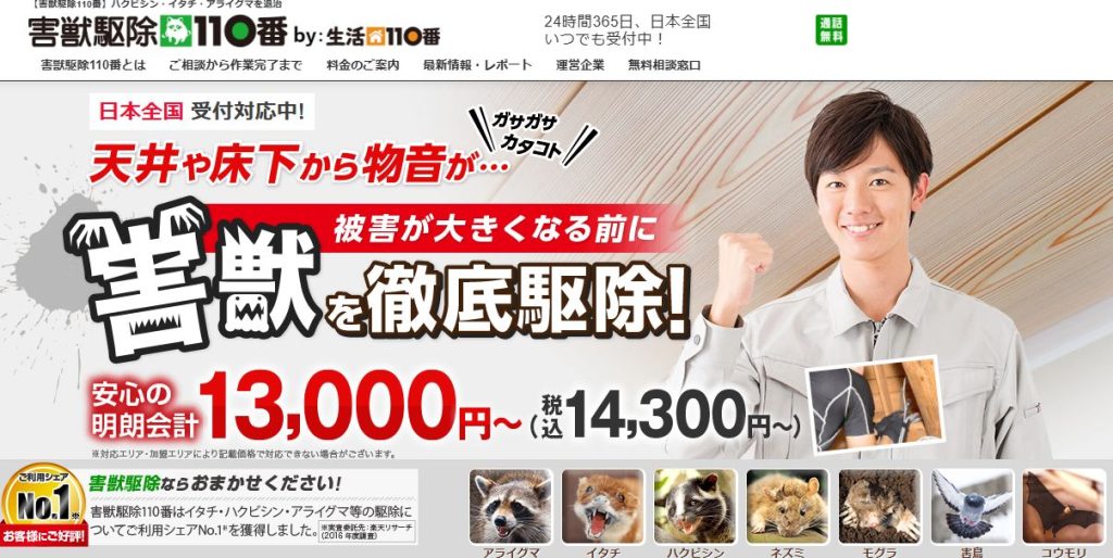 対応エリアは、北海道や沖縄まで含む日本全国となっています。害獣の種類や被害状況にもよりますが、14,300円(税込)~の明朗会計で利用できるのが強みです。