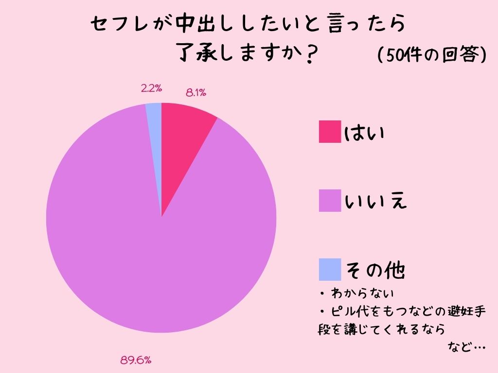パートナーではなく、「セフレが中出ししたいと言ったら了承するか」の質問では、一気にいいえが約9割になります。