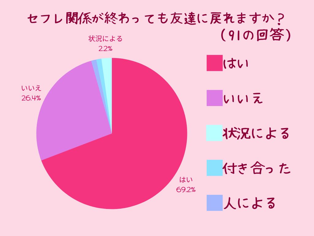 男友達とセックスをしたことがある女性に、「セフレ関係が終わっても友達に戻れるか」聞いてみたところ、はいが約70%もいました!