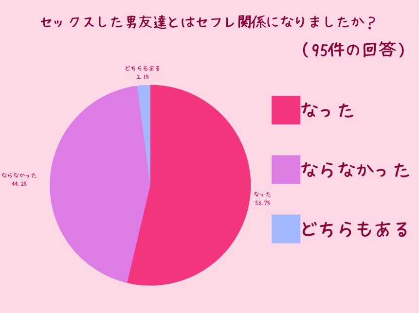 「セックスした男友達とセフレ関係になったか?」の質問は、なったとならなかったがほぼ半分くらいにわかれました。